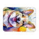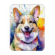A digital art image of a vibrant Corgi with large, expressive ears and a happy expression dominates the image, surrounded by splashes of colourful watercolor. The background features dynamic bursts of blue, yellow, and orange, adding a playful and energetic feel.