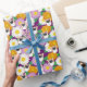 Add a cute touch to gifts with this wrapping paper that features close-up style illustrations of a corgi dogs flowers and vibrant flower graphics in white, yellow, green, orange and lavender against a purple background.