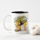 Adorable Halloween mug with a Corgi wearing a witch hat, standing on a broom, with a pumpkin and fall leaves cascading down - all in front of a full moon, and the words Happy Halloween at the top.