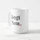 White mug with black text and a small red heart.