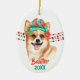 A cute Pembroke Corgi dog wears a red and green Santa Claus hat in front of strings of red and green Christmas beads on both sides of this ornament. At the bottom are two text fields in matching red and green for your own text. The back has the same image with a third text field in red. Perfect for anyone who is owned by a Corgi!