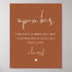 This open bar sign features an edgy handwritten font and modern minimalist design with a bohemian terracotta and white colour combination. Easily change the font and background colour to match your event. This is perfect for a wedding, couple's shower, bridal shower, engagement party or any other special event.