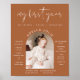 This first birthday milestone board features an edgy handwritten font and modern bohemian teracotta coloring with a cute arched photo in the middle. This year one highlight poster is perfect for your boy or girl birthday party. All colors are editable! Click the blue 'edit using design tool' button in the personalization section to use the full editor.