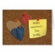 A perfect Valentine card from a child or to a man. Corkboard with heart cutouts tacked to it. A post it note with handwritten text Happy Valentine's Day.