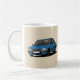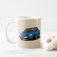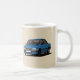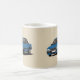 Blue French classic car from the 80's. Two blue Peugeot 505 car illustrations on a coffee mug. Great gift for retro Peugeot fans. Customise mug style and background colour.