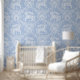 An ornate, hand-drawn pattern featuring rococo-style carousel horses and floral motifs on a soft cornflower blue background. With a dense, symmetrical layout and subtle plaster-like texture, this elegant design feels classic, nostalgic, and richly decorative—ideal for children’s spaces, storybook themes, and grandmillennial or vintage-inspired interiors.