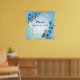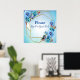 Bouquets of blue Cornflowers in watercolor with red buds and golden green leaves on a creative mix shade of a turquoise blue background draped around a golden glittering geometric frame to personalise to guide your guest to your guest book.
