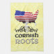 Map of the USA with roots, and blended American and Cornwall flags and the text Cornish Roots underneath.