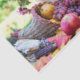 Tissue paper with a photograph of a table filled with natures bounty. Set with cornucopia, colourful harvest vegetables and fruits.