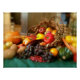 Cornucopia, horn of plenty, fruits and vegetales including pumpkins, grapes, potatoes, oranges, peppers, apples and lemons.