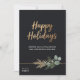 An upscale, professional holiday card designed for modern businesses. This minimalist, elegant card features a matte black/charcoal background for maximum contrast. The greeting, “Happy Holidays” is rendered in a beautiful faux gold script calligraphy, adding a premium touch without excessive shine.