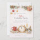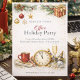 Corporate holiday design featuring an ivory textured background with red and gold accents, pine garland, ornaments, and wrapped box detail. Includes champagne flute, clock, and festive desk elements. Clean layout suited for hosting a polished office celebration in a professional setting.