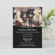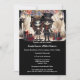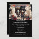 A dark and fun skeleton corpse couple are surrounded by torn beige drapes; burning black candles; glowing drop lanterns and orange and blue floral flowers set against a black background. He is wearing a dapper tuxedo and top hat adorned with small skulls and she is wearing a ruffled grey mini skirt and short sleeve top with a matching coloured hat also with small skull decorations on it. They both have glowing blue eyes and make a spooktacularly gorgeous couple. These are ideal for a "skeleton wedding", "day of the dead" or "Halloween wedding" party, function, engagement or event. Simply personalise the editable text templates to suit your occasion and feel free to change the background and font colours to any of your choice by using the edit / personalise button.