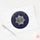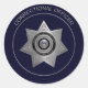 Correctional Officer Badge ROUND STICKERS-is a graphic art design. The badge is created in silver (or gold) and black with a small touch of blue. A decorative seven (7) point silver or gold star forms the badge. Text curving the top of the badge reads: DEPARTMENT OF CORRECTIONS. Text curving the bottom reads: CORRECTIONAL OFFICER. These words sit on a solid blue ring. More silver/gold decorates the badge throughout. An eagle emblem with silver/gold stars sits in the centre. Smaller text in the centre reads: Seal of the State. The badge is NOT state specific. A blue outer rim with silver/gold text curving around the top that reads: CORRECTIONAL OFFICER. This badge design comes in silver or gold with black or blue backgrounds. This background is solid blue with a silver badge, decorative silver text and silver rims.