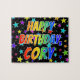 This lively, fun, birthday-themed jigsaw puzzle design features the message "HAPPY BIRTHDAY, CORY" with the characters having a colorful rainbow spectrum inspired gradient pattern, in addition to a vibrant star shapes background pattern. A vibrant puzzle like this might be a fun way to send birthday greetings to somebody named Cory. [~Z0000468]