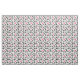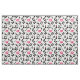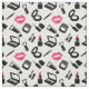 Fabric with a makeup pattern in pink, black, and white featuring cosmetics products like lipstick, mascara, eyeshadow, and more.