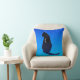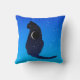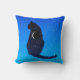 Throw pillow in a silhouette of an elegant sitting cat patterned with stars and a crescent moon on a starry sky background