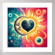 This mesmerising artwork titled "Cosmic Embrace: The Heart of the Universe" depicts a celestial phenomenon where the sun and moon align to create a heart-shaped eclipse. The sun, bursting with fiery colours from red to yellow, frames one half of the heart while the cool, tranquil hues of the moon complement the other, set against a backdrop of a star-filled space. The face on the crescent moon adds a serene and mystical touch to the scene, embodying the peaceful slumber of the cosmos. Swirls of stars and celestial bodies dance around in a harmonious blend of colours and shapes, evoking feelings of love and unity on a cosmic scale. Perfect for anyone who appreciates the beauty of the universe or enjoys artworks that fuse elements of fantasy with cosmic phenomena.