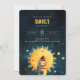 Embark on a stellar journey to celebrate a milestone with our Cosmic First Birthday Blast invitation! This invitation is a two-sided ticket to the fun that will take your little astronaut's first birthday party to interstellar heights. The front of the invitation features an adorable baby peeking out from a vibrant orange and yellow rocket ship, with the sun's radiant beams creating a backdrop that's out of this world. Surrounding planets and stars twinkle against the deep navy and midnight blue cosmos, inviting guests to join the 'First Trip Around The Sun.' The back provides all the party details set against a starry space scene, accented with bold typography in hues of goldenrod, sunflower, and mustard over an enigmatic space blue. This cosmic invitation is perfect for your little star's big day, promising an unforgettable galactic gathering!