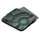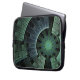 Laptop sleeve with "Cosmic Pod", abstract art, copyright © 2008, Susan Wallace. A circular labyrinthine pattern in shades of green and blue, combining geometric shapes in a complex futuristic design.