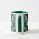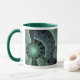 Coffee mug with "Cosmic Pod", abstract art, copyright © 2008, Susan Wallace. A circular labyrinthine pattern in shades of green and blue, combining geometric shapes in a complex futuristic design.
