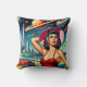 A confident, retro-style woman among the planets and rockets that surround the guests at the beach. The vivid colors, bold energy, and vintage theme pay tribute to the thrilling imagination of midcentury book covers and movie posters.