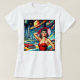 A confident, retro-style woman among the planets and rockets that surround the guests at the beach. The vivid colors, bold energy, and vintage theme pay tribute to the thrilling imagination of midcentury book covers and movie posters.