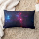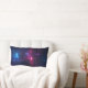 A lumbar pillow with a blue, pink and black fantasy image of cosmic space with stars and wispy nebula.