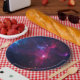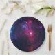 Paper plates with a blue, pink and black fantasy image of cosmic space with stars and wispy nebula.