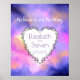 An elegant poster which says "Welcome to our Wedding" with a nice combination of pastels and bright colors. A colorful abstract painting with a cosmic space image in pink, purple and yellow watercolors. The colors blend and mix together creating luminous ethereal forms with little twinkling stars peppered throughout. Personalize with your names and wedding date inside a fancy heart shape.