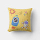 Super cute, whimsical pillow is yellow with a starry background and has an astronaut and a space rocket, with stars in the sky and a hot sun. Reverse side is yellow with stars.