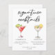 This sophisticated signature cocktails menu sheet features simple black typography above 2 of your favourite drinks and their ingredients for your coastal wedding bar. A chic Cosmopolitan and Lemon Drop drawing add a fun flair to your bar menu. Complete with the couple's names and date for their reception.