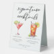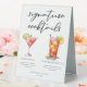 This sophisticated signature cocktails table tent sign features simple black typography above 2 of your favourite drinks and their ingredients for your coastal wedding bar. A chic Cosmopolitan and Long Island Iced Tea drawing add a fun flair to your bar menu. Complete with the couple's names and date for their reception.