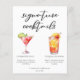 This sophisticated signature cocktails menu sheet features simple black typography above 2 of your favourite drinks and their ingredients for your coastal wedding bar. A chic Cosmopolitan and Tequila Sunrise drawing add a fun flair to your bar menu. Complete with the couple's names and date for their reception.