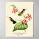 Vintage natural history illustration by Antoine-Germain Bevalet, c. 1874, of the Costa's Hummingbird (Calypte costae.) Two green and gold hummingbirds perch on a tropical plant with pink flowers, on a light golden yellow parchment texture background. Digitally cleaned and enhanced while still retaining its vintage characteristics. Features common and scientific names in decorative fonts. Sized to fit standard frame.