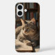 A peaceful tabby cat enjoying a cosy reading moment, perfect for calm and literary-themed phone cases.