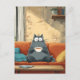 A cute, fluffy grey cat sits wide-eyed on a bright orange couch, clutching a warm cup of coffee. Soft sunlight fills the cosy living room, complete with pillows, books, and rustic charm. Perfect for cat lovers and coffee enthusiasts alike, this whimsical illustration brings warmth, humour, and relaxation to any space. Ideal for mugs, prints, and home decor.