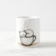 A fluffy white kitten peacefully sleeps curled up inside a warm coffee mug, with steam rising gently around it, evoking a sense of comfort and warmth.