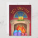 Snuggle up in your favourite fuzzy socks this holiday season. This Cosy Christmas card captures that warm and comforting feeling of spending time with your loved ones at home by a warm fire on a cold and snowy night. The illustration features the glow of a fireplace with holly leaves and burning candles sitting on the mantel. Above the fire is window looking out at the midnight blue sky with snow falling.