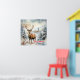 Simple pastoral watercolor Christmas scene with watercolor reindeer in snow forest and holly berries. Red festive script "Merry Christmas"