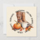 Celebrate the warmth and beauty of fall with this cosy autumn greeting card featuring boots, pumpkins, a cup of coffee or pumpkin spice latte, and colourful autumn leaves. The words "Sweaters, Falling Leaves, Pumpkin, Cider, Hayrides, Bonfires" capture the magic of the season, making this perfect for fall lovers, Thanksgiving gatherings, and autumn.