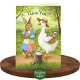 Express your gratitude with this cute greeting card featuring a sweet pair of friends, a goose and a rabbit. They are hanging out in their forest neighbourhood and chatting over a cup of tea. Surrounded by lush green trees, grasses, blue sky and woodland charm, these friends are here to help you say thank you! The rabbit is wearing a patchwork apron and the goose is carrying a basket of fresh picked wild mushrooms to share.
