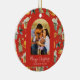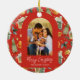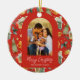This sweet Christmas ornament features a cosy holiday pattern with illustrated winter houses decked out in beautiful Christmas decor, along with festive ivy and rustic pine elements on a red background. A centre front photo sits in a modern arch shape, and Merry Christmas script and customised name sit below. Shop this store for coordinating Christmas greeting cards and additional holiday colour options!