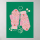 A pair of pink mittens adorned with intricate mandala patterns rests against a vibrant green background. Each mitten features heart accents and is connected by a whimsical string with fluffy pom-poms, exuding festive warmth and cheerful wishes.