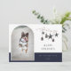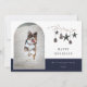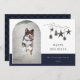Trendy rustic Scandinavian style holiday photo card. Single photo with arch frame shape. Watercolor branch adorned with pinecones and decorative star ornaments, chic typography design with trendy plaid pattern backing.