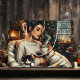 Christmas gift bag. A sweet cosy scene with a woman reading a book while drinking hot cocoa or coffee while cuddling with her cat on a Papason chair with a Christmas background. Pretty festive holiday candle with a warm cosy vibe. Warm vintage colours and snowflakes background.