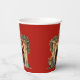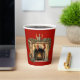 Paper cups with a warm and cosy illustration featuring an old fashioned fireplace. Stocking hanging with care. Garland hanging over the mantel. A warm roaring fire in the hearth.