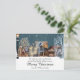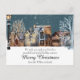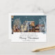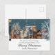 This custom holiday or Christmas postcard features a cosy watercolor style illustration. An image of a little winter village at night is printed across the centre portion. A glowing lamppost is pictured on the left, and falling snow gently covers the houses in the town. A sample greeting and family name are printed across the bottom which you can personalise to include your own custom name and text.