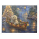 Set sail into the magic of the holiday season with this beautifully detailed illustration, showcasing a proud dog sitting in a festively decorated boat, gliding across a serene Christmas lake. The twinkling lights from nearby pine trees reflect off the water, casting a warm, festive glow that enhances the cosy ambiance. Ornaments dangle from the boat's sides, while glowing lanterns light the way, creating a scene that captures the true essence of Christmas warmth and joy. This nostalgic artwork brings a touch of holiday magic to any space, perfect for those who cherish the spirit of the season.