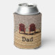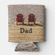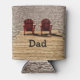 Summer cottage on the lake personalised custom can coolers for dad. Brown burgundy beach chairs on a dock brown, beige, Father's Day beer holder. Modern, unique, cool, nice, trendy, chic, rustic cabin style camp lodge item. Printed personalised design trending camp life. Phrase 'Dad' Customise your text by font size, style, colour or remove if desired. Look for matching products in my store collection. Image copywrite Marg Seregelyi Photography.
